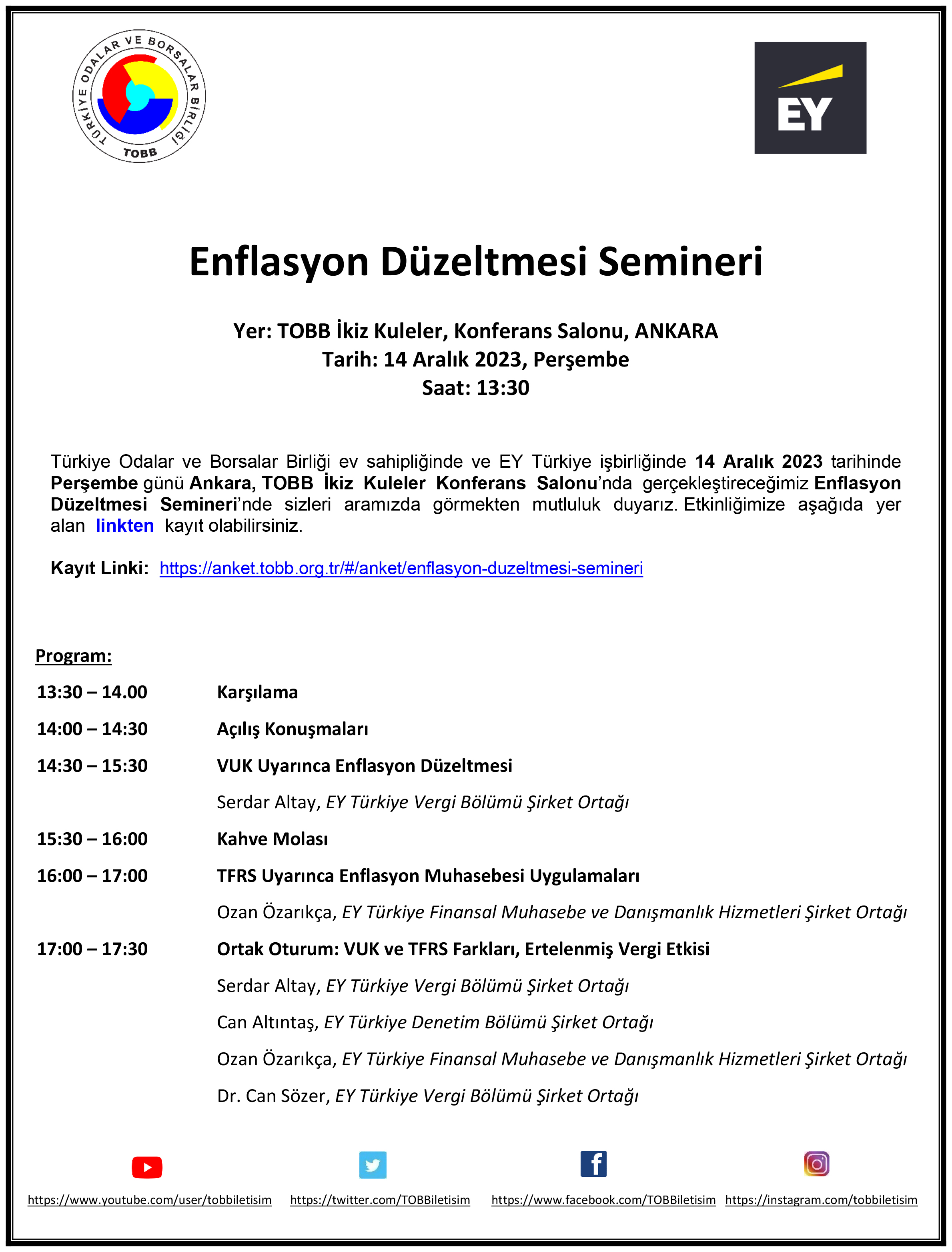 DESCRIPTION:Sayın Üyemiz,\NTürkiye Odalar ve Borsalar Birliği’nin 06.01.2026 tarih ve 191 sayılı yazısına istinaden; \NTicaret Bakanlığı tarafından, Ticaret Müşavir ve Ataşelerimiz ile iş dünyamızı bir araya getirmek üzere "Ticaret Müşavirlerimizle Elektronik Sohbet" toplantıları düzenlenmektedir. İlgi yazı ile Ocak ayında gerçekleştirilecek e-sohbet toplantıları bildirilmekte olup katılım linkleri aşağıda yer almaktadır. \N· Zambiya Pazarına Giriş, 29 Ocak 2026 - 15.00; https://bit.ly/3LpEvt4 \NKonu hakkında bilgilerinizi rica ederiz.\NSaygılarımızla