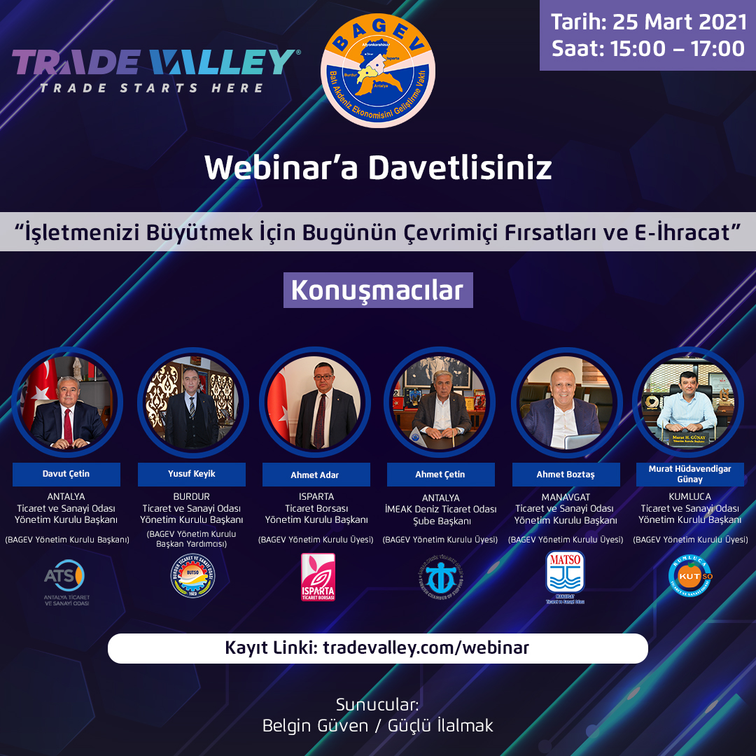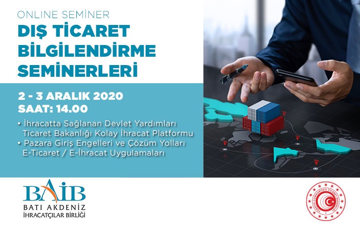 DESCRIPTION:Ticaret Bakanlığı görev alanına giren konularda iş çevrelerinin bilgilendirilmesi amacıyla Bakanlıkları, Türkiye İhracatçılar Meclisi ve Türkiye Odalar ve Borsalar Birliği koordinasyonu; Antalya Organize Sanayi Bölgesi, Burdur Ticaret ve Sanayi Odası, Isparta Ticaret ve Sanayi Odası, Manavgat Ticaret ve Sanayi Odası işbirliği ve Birliğimiz organizasyonu ile 10 – 13 Aralık 2019 tarihleri arasında Isparta, Burdur, Antalya ve Manavgat’ta “Dış Ticaret Bilgilendirme Seminerleri” düzenlenecektir.Seminerlere katılım ücretsiz ve herkese açık olup katılımcı sayısı hakkında bilgi sahibi olunması için https://forms.gle/Bwsw5bGk3y2JsewT7 linkinde yer alan formun en geç 6 Aralık 2019 Cuma günü mesai bitimine kadar doldurulması önem arz etmektedir.\NDetaylı Bilgi İçin:Batı Akdeniz İhracatçılar Birliği Genel Sekreterliği 0 242 505 10 22 – Gizem ALP TOPÇU\NDIŞ TİCARET BİLGİLENDİRME SEMİNERLERİ PROGRAMI10 ARALIK 2019 ISPARTA,11 ARALIK 2019 BURDUR,12 ARALIK 2019 ANTALYA,13 ARALIK 2019 MANAVGAT-ANTALYA,\N13.00-13.30 Kayıt /Açılış13.30-15.00 İhracat Mevzuatı ve Dahilde ve Hariçte İşleme RejimleriAhmet KÜÇÜKASLANTicaret Bakanlığı İhracat Genel Müdürlüğü,İhracatı Geliştirme Uzmanı\N15.00-15.15 Çay / Kahve Arası\N15.15-16.30 İhracatta Sağlanan Devlet Yardımları\N- Yurt Dışında Gerçekleştirilen Fuar Katılımlarının Desteklenmesi\N- Türk Ürünlerinin Yurtdışında Markalaşması, Türk Malı İmajının Yerleştirilmesi ve TURQUALITY’nin Desteklenmesi ile Yurt Dışı Birim Marka ve Tasarım Destekleri\N- Uluslararası Rekabetçiliğin Geliştirilmesinin Desteklenmesi, Pazar Araştırması ve Pazara Giriş Desteği, E- Ticaret Sitelerine Üyelik Desteği, Pazara Giriş Belgelerinin Desteklenmesi\NAli ERDALTicaret Bakanlığı İhracat Genel Müdürlüğü,Ticaret Uzmanı\N16.30-16.45 Çay / Kahve Arası\N16.45-17.30 Ülke Sunumu – BAE Pazarına İhraç İmkanları\NHarun KOÇAKTicaret Bakanlığı, Dış Temsilcilikler ve Uluslararası Etkinlikler Genel MüdürlüğüTicaret Uzmanı\NSEMİNER YERLERİ\N10 Aralık 2019 13:00 – 17:30 ISPARTAİş Birliği Kuruluşu : Isparta Ticaret ve Sanayi OdasıAdres : Isparta Ticaret ve Sanayi Odası Toplantı SalonuIsparta Ekonomi Kampüsü Süleyman Demirel Bulvarı 102.Cad. No:185 ISPARTA\N11 Aralık 2019 13:00 – 17:30 BURDURİş Birliği Kuruluşu : Burdur Ticaret ve Sanayi OdasıAdres : Burdur Ticaret ve Sanayi Odası Konferans SalonuYeni Mahalle Şehit Teğmen Halil Demirörs Cad. No:2 BURDUR\N12 Aralık 2019 13:00 – 17:30 ANTALYAİş Birliği Kuruluşu : Antalya Organize Sanayi BölgesiAdres : Antalya Organize Sanayi Bölgesi Müdürlüğü Atatürk Konferans SalonuAntalya Organize Sanayi Bölgesi 1.Kısım 5. Cadde No:5 Döşemealtı/ANTALYA\N13 Aralık 2019 13:00 – 17:30 MANAVGAT – ANTALYAİş Birliği Kuruluşu : Manavgat Ticaret ve Sanayi OdasıAdres : Manavgat Ticaret ve Sanayi Odası Meclis SalonuAydınevler Mah. 5578 Sok. No:1 Manavgat / ANTALYA