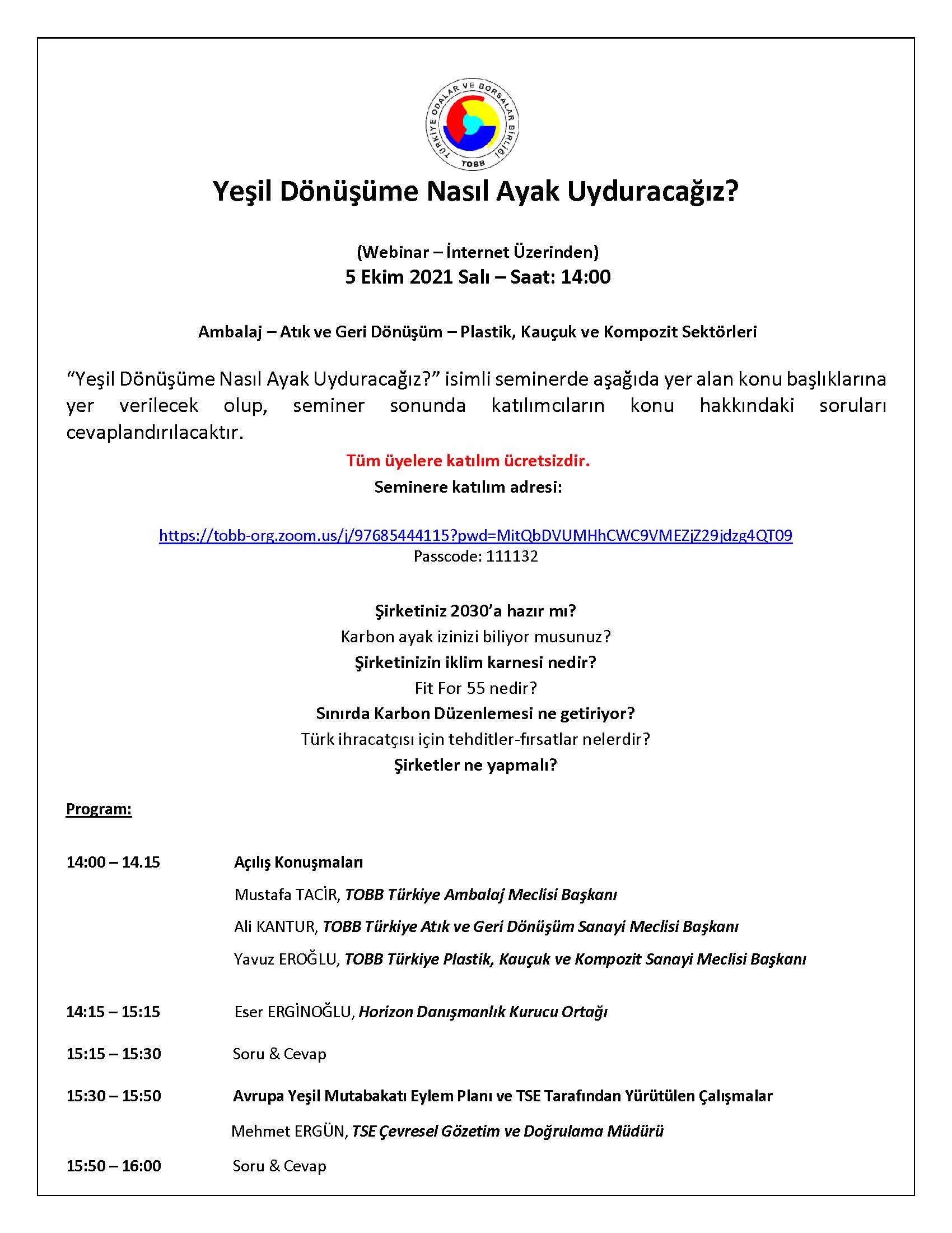 DESCRIPTION:Sayın Üyemiz,İlgi : Ticaret Bakanlığı'ndan alınan 18.02.2026 tarihli ve 119099695 sayılı yazı.Ekte bir örneği sunulan ilgi yazıda, 24-26 Mart 2026 tarihlerinde Ticaret Bakanlığı tarafından "Ticaret Bakanlığı İhracat Süreçleri ve Devlet Destekleri Eğitim Programı"nın çevrimiçi olarak gerçekleştirileceği belirtilmiş olup, programa katılmak isteyenlerin 19 Mart 2026 tarihi mesai bitimine kadar yazıda verilen kayıt linki üzerinden kayıt yaptırabileceği bildirilmiştir. \NKayıt Bağlantısı: https://egitimbasvuru.ticaret.gov.tr/Ihracat\NEK: Ticaret Bakanlığı İhracat Süreçleri ve Devlet Destekleri Eğitim Programı\N24 Mart 202613.30-13.35 Açılış Konuşması13.35-15.30 Genel İhracat Eğ t m (T car B lg ye Er ş m, Uluslararası T car Kurallar ve Hedef Pazar Tesp t )15.30-17.15 Mal İhracatına Yönel k Sağlanan Devlet Destekler15.30-15.55 Uluslararası Rekabetç l ğ n Gel şt r lmes ne Yönel k Devlet Destekler15.55-16.20 Yeşil Mutabakata Uyum Projesi Desteği “Responsible” Programı 16.20-16.40 Fuar Destekler16.40-17.15 Markalaşma ve Tasarım Destekler25 Mart 202614.00-14.35 E-İhracat Destekler / Kolay İhracat Platformu14.35-15.05 H zmet İhracatına Yönel k Sağlanan Devlet Destekler15.05-15.35 Ticaret Bakanlığı Destek Yönetim Sistemi (DYS) 15.35-16.20 Dah lde ve Har çte İşleme Rej mler16.20-16.50 İhracatta Gümrük Mevzuatı ve Uygulamaları26 Mart 202610.00-10.45 Ülke Sunumu-Güney Kore Pazarına İhraç İmkanları10.45-11.30 Pazara Giriş Engelleri ve Çözüm Yolları 11.30-11.50 Ticarette Teknik Engeller 11.50-12.20 Avrupa Birliğine İhracatta Zorunlu Yeni Uygulama: Avrupa Yeşil Mutabakatı ve Karbon Vergisi 12.20-12.45 Ürün Güvenliği, Avrupa Yeşil Mutabakatı ve Sürdürülebilir Ürün Mevzuat Güncellemelerinin İhracata Etkisi 12.45-13.15 Sınav